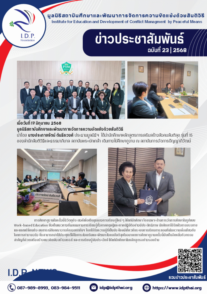 ได้นำนักศึกษาหลักสูตรการเสริมสร้างสังคมสันติสุข รุ่นที่ 15ของสำนักสันติวิธีและธรรมาภิบาล สถาบันพระปกเกล้า