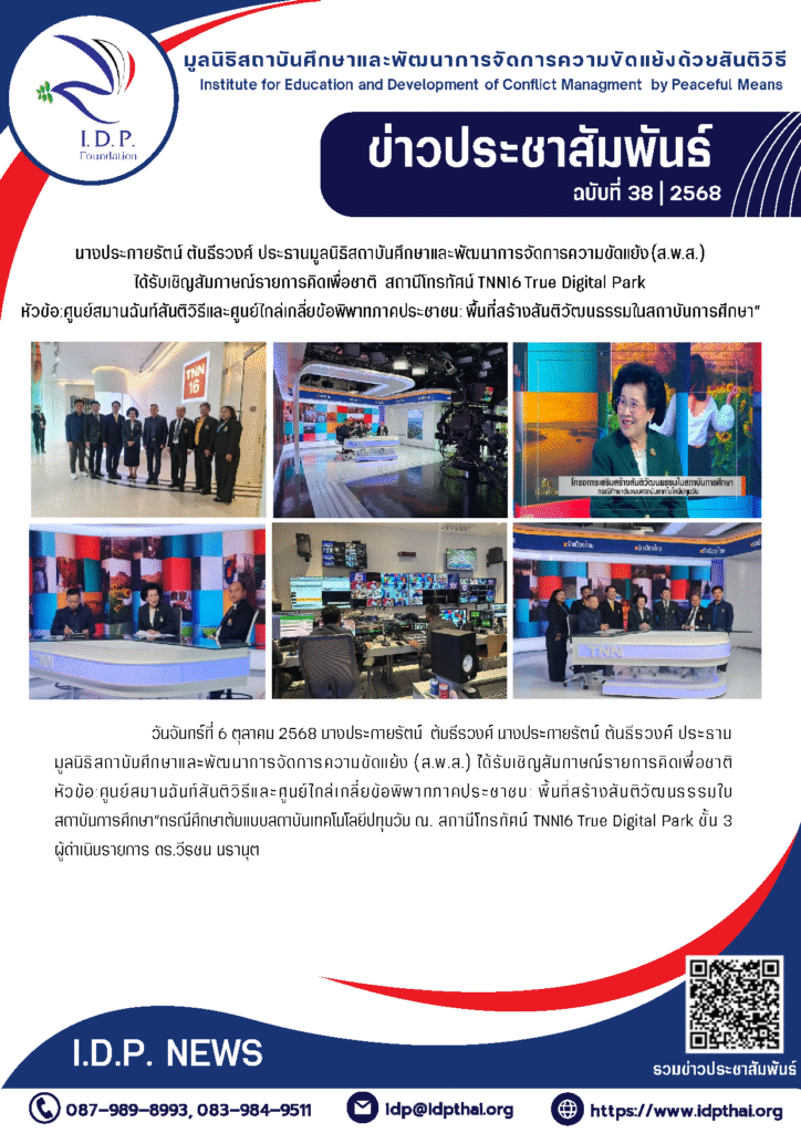 วันจันทร์ที่ 6 ตุลาคม 2568 นางประกายรัตน์ ต้นธีรวงศ์ นางประกายรัตน์ ต้นธีรวงศ์ ประธานมูลนิธิสถาบันศึกษาและพัฒนาการจัดการความขัดแย้ง (ส.พ.ส.) ได้รับเชิญสัมภาษณ์รายการคิดเพื่อชาติ