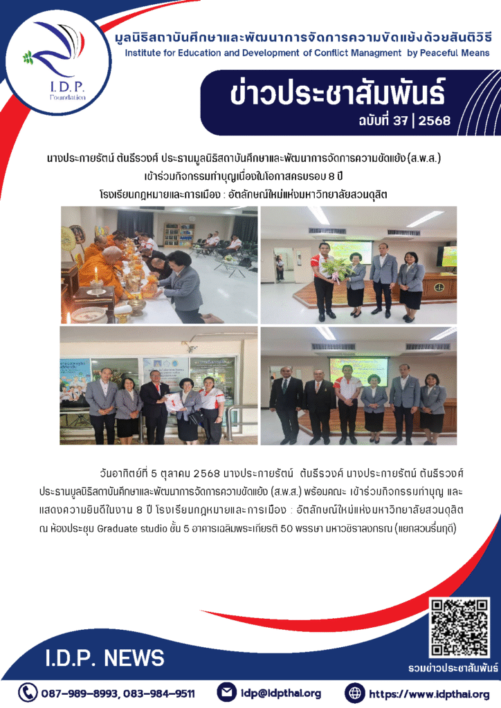 ประธานมูลนิธิสถาบันศึกษาและพัฒนาการจัดการความขัดแย้ง (ส.พ.ส.) พร้อมคณะ เข้าร่วมกิจกรรมทำบุญ และแสดงความยินดีในงาน 8 ปี โรงเรียนกฎหมายและการเมือง