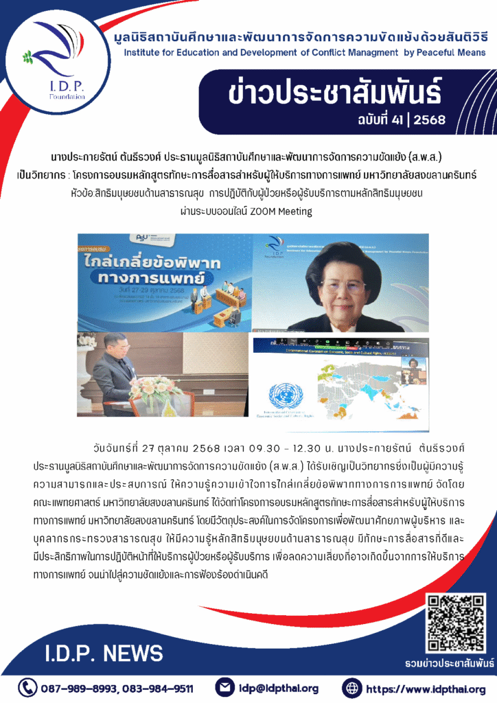เป็นวิทยากร : โครงการอบรมหลักสูตรทักษะการสื่อสารสำหรับผู้ให้บริการทางการแพทย์ มหาวิทยาลัยสงขลานครินทร์